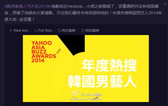 KHJ won "Hot Search Korean Male Artist of the Year Award 2014" but no video message from HJ